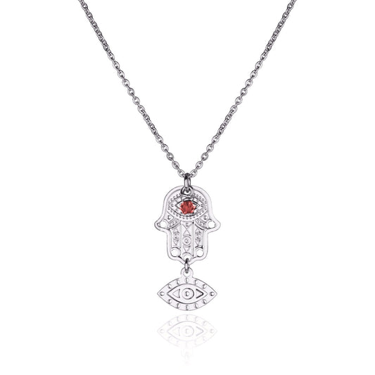 Collier trois pendentifs oeil main de fatma cristal rouge
