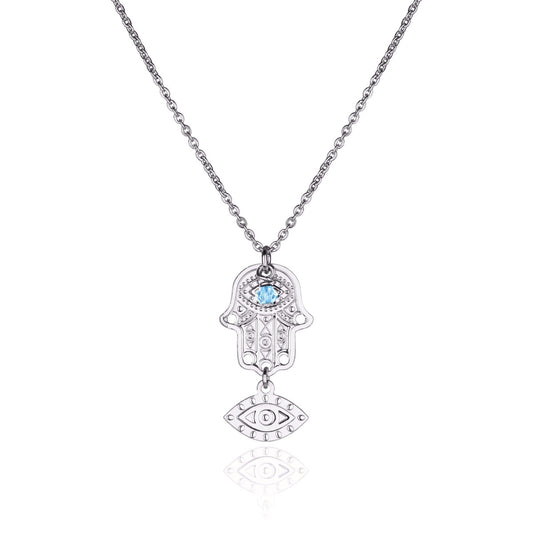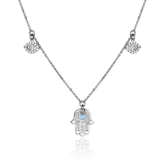 Collier trois pendentifs oeil main Fatma cristal bleu